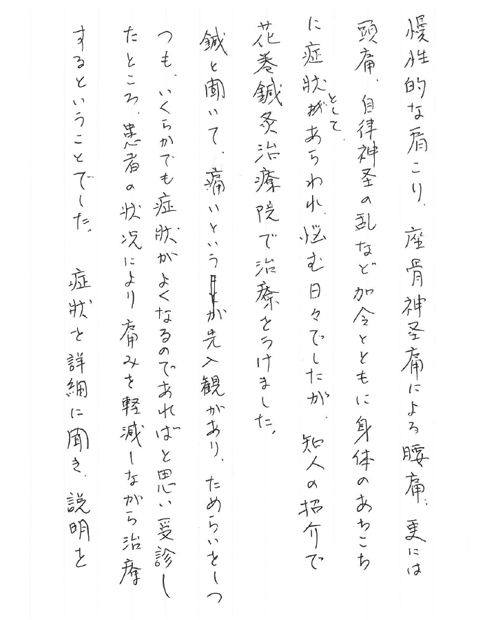 強い腰痛があり近所の「整骨院」に10日以上通院しましたが痛みが変わり無く 、花巻鍼灸治療院で回復した友人の紹介で来院しました。2日後には海外出張の為、心身がボロボロでしたが、時間を掛けて問診や病状の説明をしてくれた事で安心出来ました。